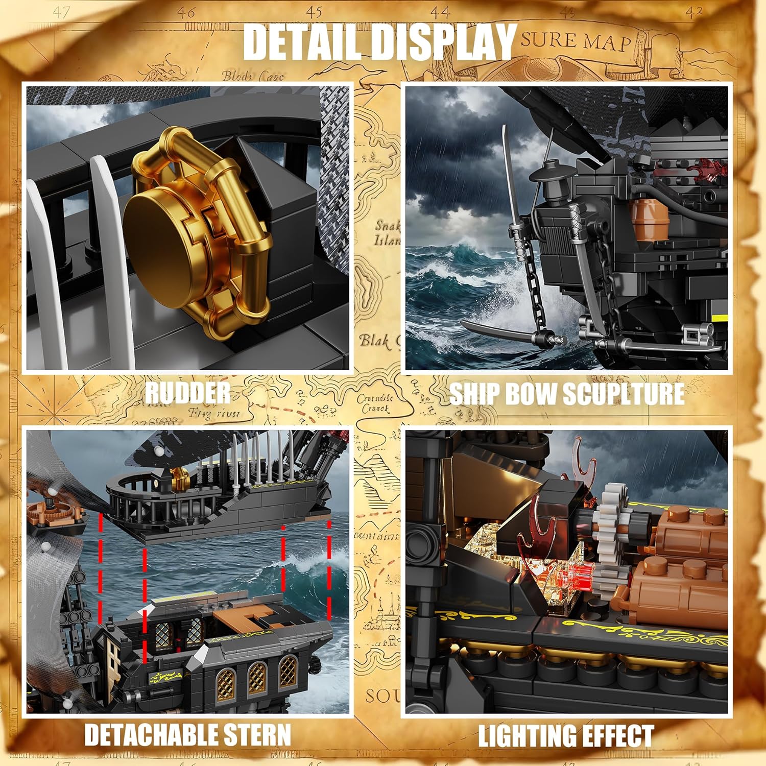 - 【Lighting Black Pearl Ship】Equipped with 2 LED lights to restore the mysterious and exciting adventure atmosphere of traveling through the sea.But it's not just about the lighting –the pirate ship features a fully rotatable rudder, openable hatches, and realistic ship bow sculpture that invite exploration. Equip the deck with swivel cannons, raise the Jolly Roger sail and set sail on imaginary voyages across uncharted waters